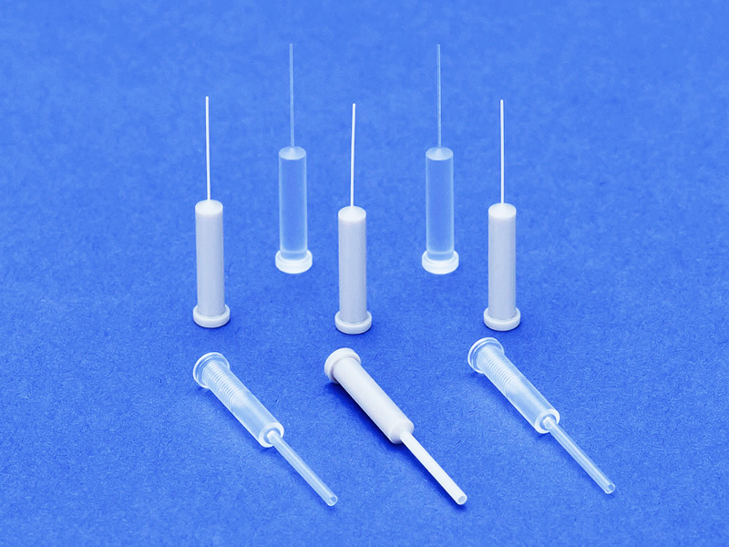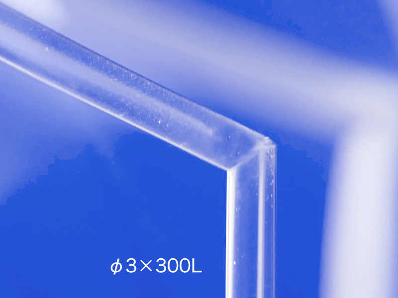 長穴加工に共通する最大の難点は真っ直ぐあけられるか? にあります。どの加工にも共通して言えることですが、工具選定、様々な加工条件でベストな物を選び、治具作成にも一工夫、二工夫施し、樹脂加工は面粗度、真円度を保つ事が通常加工では難しいとされる小径での L/D10 (φ3×30L ) を遥かに超えるφ3×300Lの透明穴加工も実現。こちらは角度のついた反対側からも同様に穴あけを行っていますが接点のズレを最小限に抑えることにも成功しています。